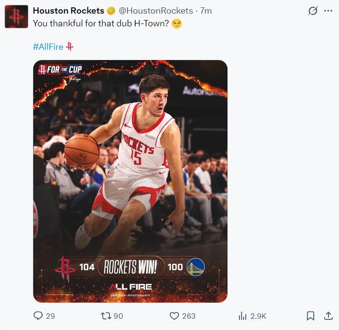 北京时间11月27日,NBA杯赛,火箭以104-100逆转击败勇士拿到二连胜。这场比赛火箭在一度落后勇士14分的情况下完成逆转,逆转的大功臣是谢泼德,核心申京这场比赛真的要感谢谢泼德,申京关键两罚全铁,全场比赛18中7+三分4中0,他被科尔完全冰封好在谢泼德决胜两罚全中。